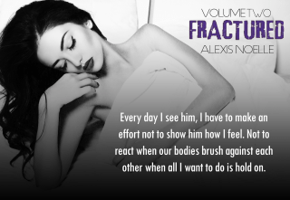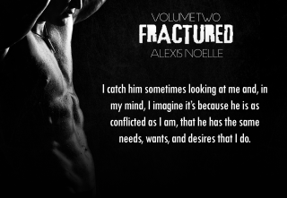 Fractured volume 2 by Alexis Noelle is the next book in the Fractured series. The book picks up 4 months after Shay received the devastating news that the love of her life, a man she has been with for ten years and recently married was killed while on deployment in Afghanistan. She is an emotional and physical wreck. She has closed herself up for the past 4 months and the only person she has spoken to has been her mother. One day someone opens her front door and challenges her to get her life together.