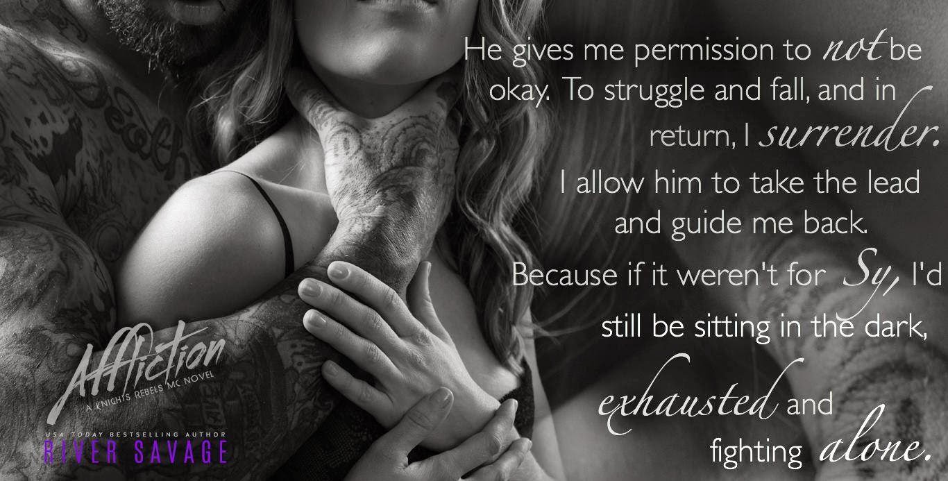 Affliction by River Savage is the second book in the Knight Rebel series. Affliction is the story of Sy and Holly. Sy is one of the brothers of the Knight Rebels who runs the tattoo parlor and Holly is Kadence’s best friend. We first met them in book one when Kadence and Holly went into Sy’s tattoo parlor. Sy and Holly have had a very strange love hate relationship.