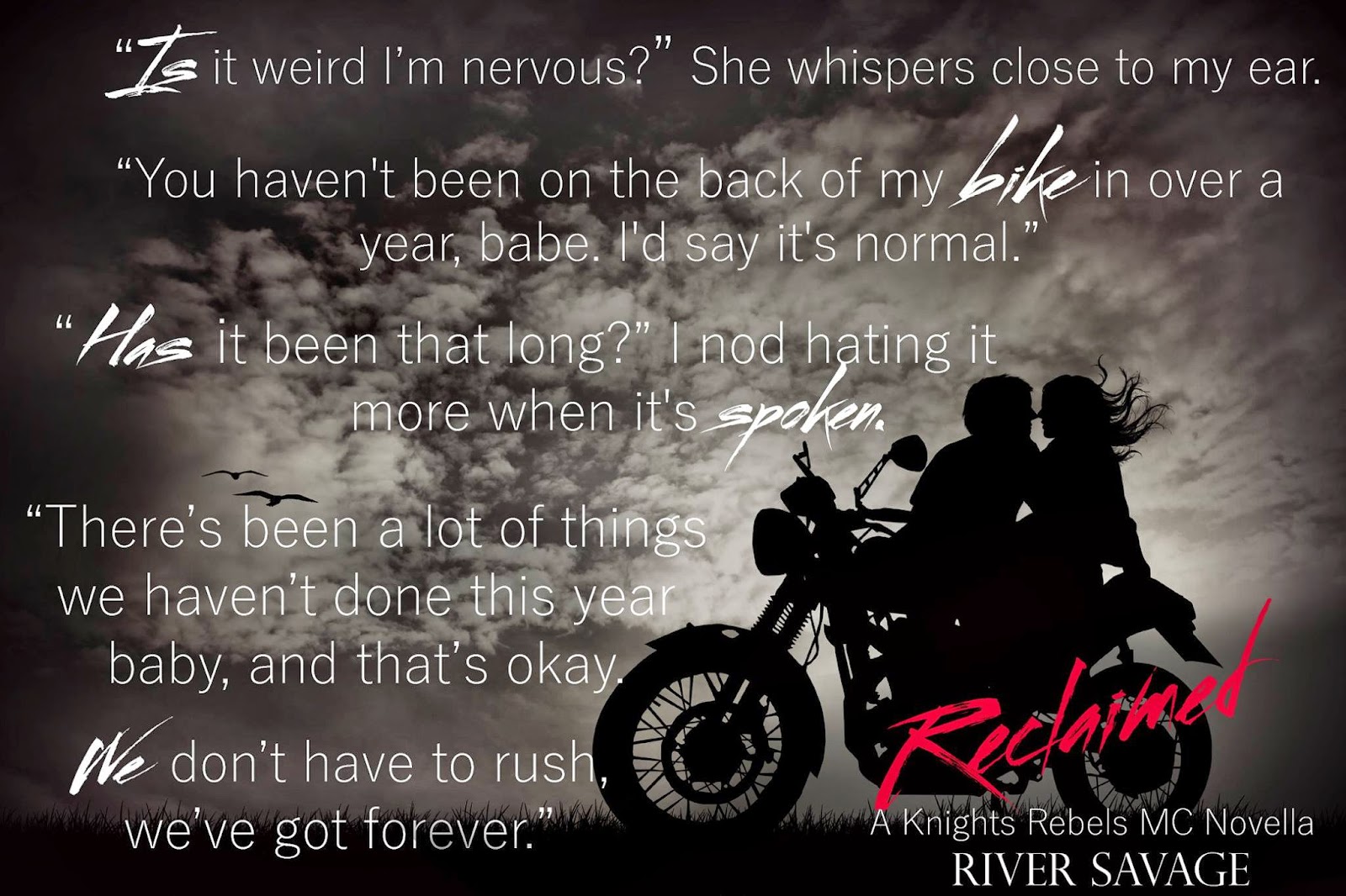 Reclaimed by River Savage is book 2.5 in the Knight Rebel series. Reclaimed is a short read novella about Nix and Kadence and the birth of their daughter. The book tackles a subject that many women experience after given birth- postpartum depression. Kadence is having a hard time dealing with the birth of Harlow. Nix is having a hard time raising the baby and Z by himself. But Nix does love his wife with all his heart and will do whatever he has to get his wife and family back together. In typical Nix and Kadence fashion nothing is easy or simple. The two are a regular laugh riot and he may not admit it but yes Nix is pu**y whipped.