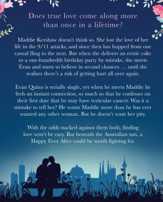 Does true love come along more than once in a lifetime? Maddie Kershaw doesn’t think so. She lost the love of her life in the 9/11 attacks, and since then has hopped from one casual fling to the next. But when she delivers an erotic cake to a one-hundredth birthday party by mistake, she meets Evan and starts to believe in second chances … until she realises there’s a risk of getting hurt all over again. Evan Quinn is serially single, yet when he meets Maddie he feels an instant connection, so much so that he confesses on their first date that he may have testicular cancer. Was it a mistake to tell her? He wants Maddie more than he has ever wanted any other woman. But he doesn’t want her pity.With the odds stacked against them both, finding love won’t be easy. But beneath the Australian sun, a Happy Ever After could be worth fighting for.