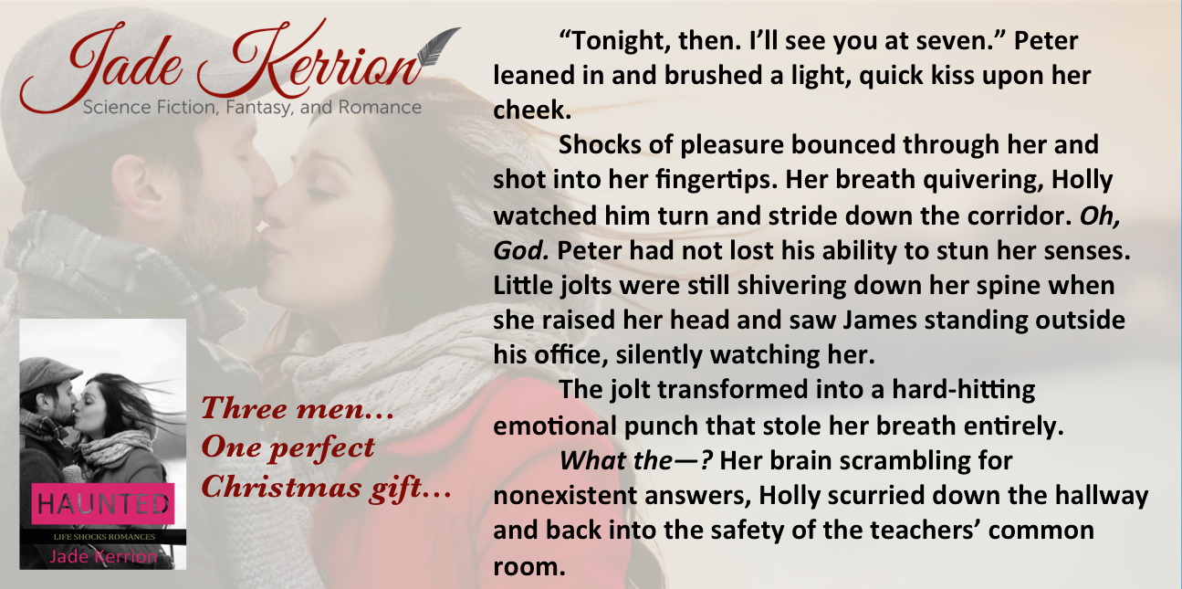 Jade Kerrion writes her award-winning science fiction, fantasy, and contemporary novels at 3:00 a.m. when her husband and three sons are asleep. She aspires to make her readers as sleep-deprived as she is. Her alphabetical Life Shocks Romances series anchors around unlikely romances you will root for and happy endings you can believe in. Her favorite romance is the Double Helix love triangle between Galahad—the lab-created perfect human being; Danyael—an alpha empath and Galahad’s physical template; and Zara—the woman who can wreak more havoc with love than most people can with hate. Join Jade Kerrion’s Romance Readers mailing list for a FREE copy of Aroused: http://bit.ly/GetAroused