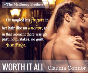 This is the first book that I have read by Claudia Connor. This is Jake “JT” McKinney the youngest McKinney Brother & Paige Robert’s story and is the third book in The McKinney Brothers Series. Worth It All can be read as a standalone but, I couldn’t help but want to have read the first 2 books in this series so I could know more about the other family members.