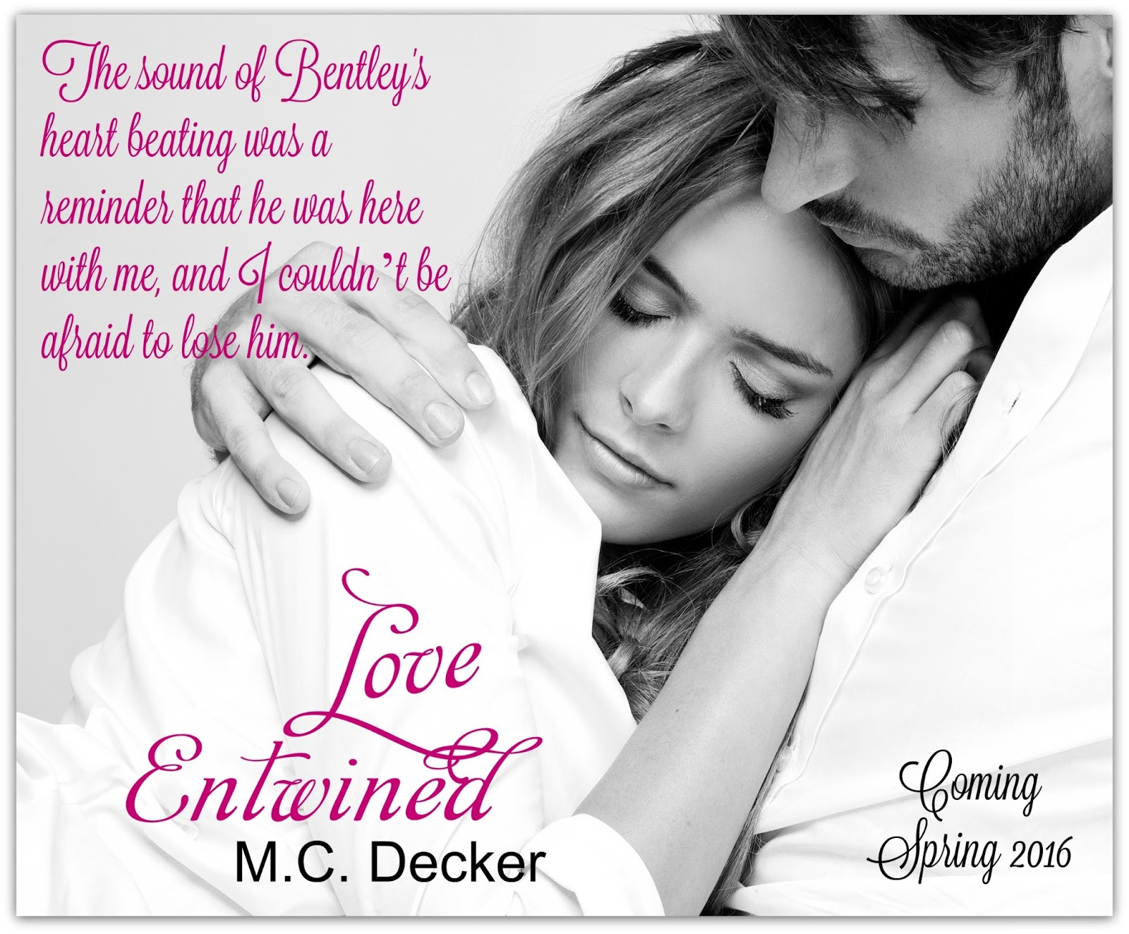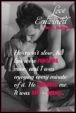 M.C. Decker is the author of the Unspoken Series, which includes Unwritten and Unscripted, and the upcoming standalone novel Love Entwined. She lives in a suburb of Flint, Michigan with her husband, Brian, and spoiled-rotten Siamese cat, Simon. For the last decade, she has worked as a journalist for several community newspapers in Mid-Michigan and Michigan’s Thumb region. She enjoys all things ’80s and ’90s pop culture: movies, boy bands, music and especially the color, hot pink. She also strictly lives by the motto, “Life is better in flip flops,” and is a diehard Detroit Tigers fan.