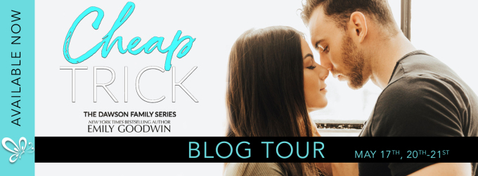 Cheap Trick, a full-length, friends-to-lovers/fake fiancé, standalone romance novel by New York Times bestselling author Emily Goodwin.